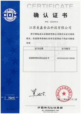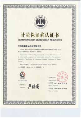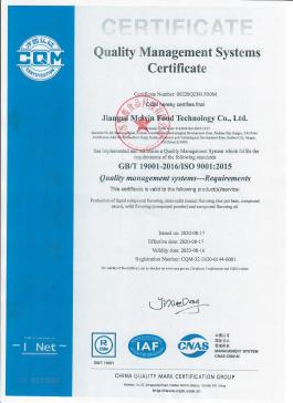 2020 年獲得了質量管理體系認證證書、危害分析與關鍵控制點(HACCP)管理體系證書,至今一直有效持有證書。